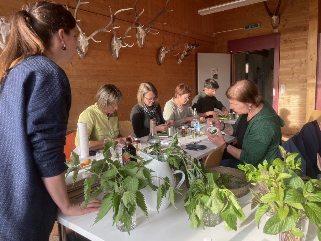 Kursleiterin Andrea Nater zeigt, welche Heilkräuter rund um die Naturschule wachsen. Danach wird angerührt: Aus den Pflanzen entstehen Tinkturen und ein Insektenstich-Heiler.