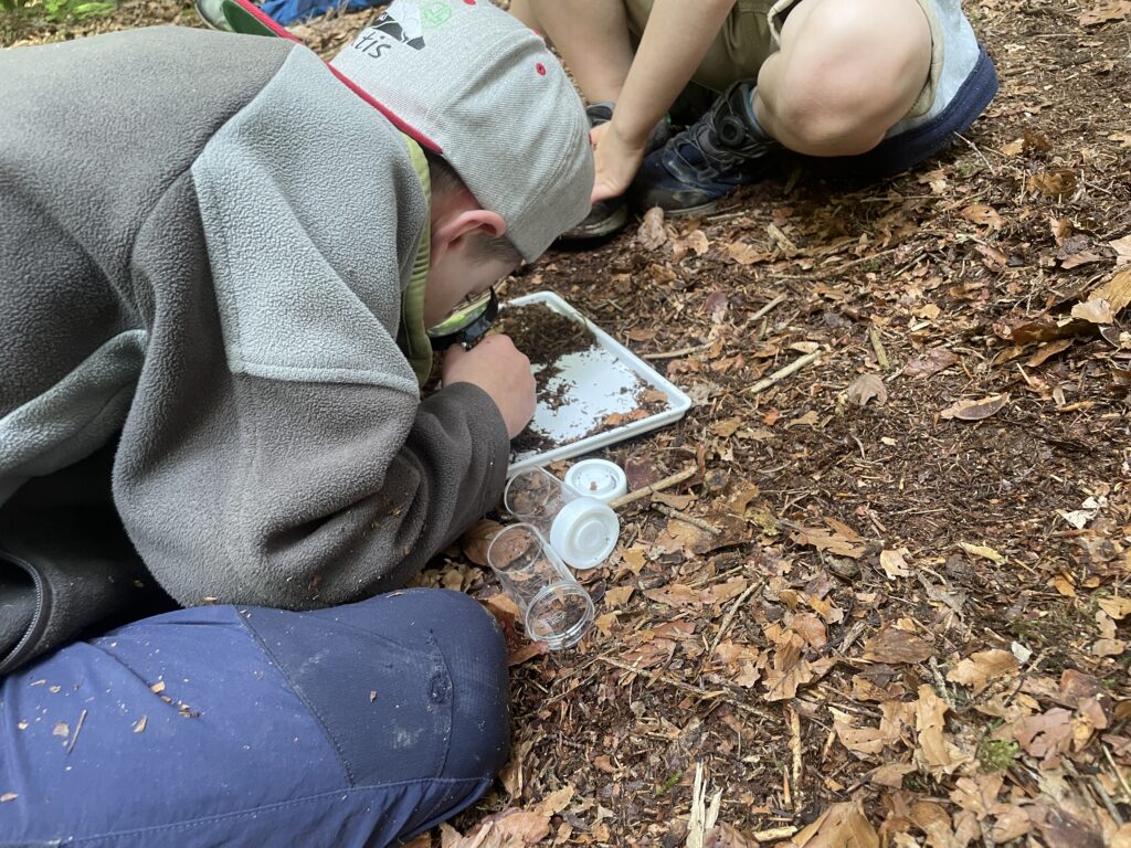 Erst- und Zweitklässer aus der Schule Riethüsli untersuchen am Wald- und Naturerlebnistag den Waldboden.
